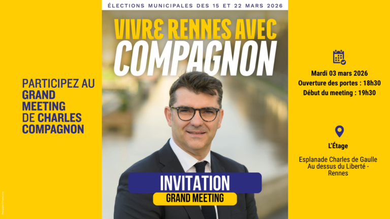 Réunion publique mars 3 @ 7:30 pm - 9:00 pm Grand meeting • Vivre Rennes avec Charles Compagnon ! À quelques semaines du 1er tour des élections municipales, Charles Compagnon et toute l’équipe VIVRE RENNES ! ont le plaisir de vous inviter à notre grand meeting de campagne. view details